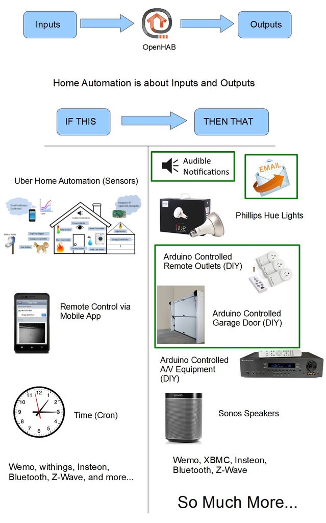 The Spark Core can be used for various wifi-connected sensor and actuator nodes, all controlled and monitored via the OpenHAB app.