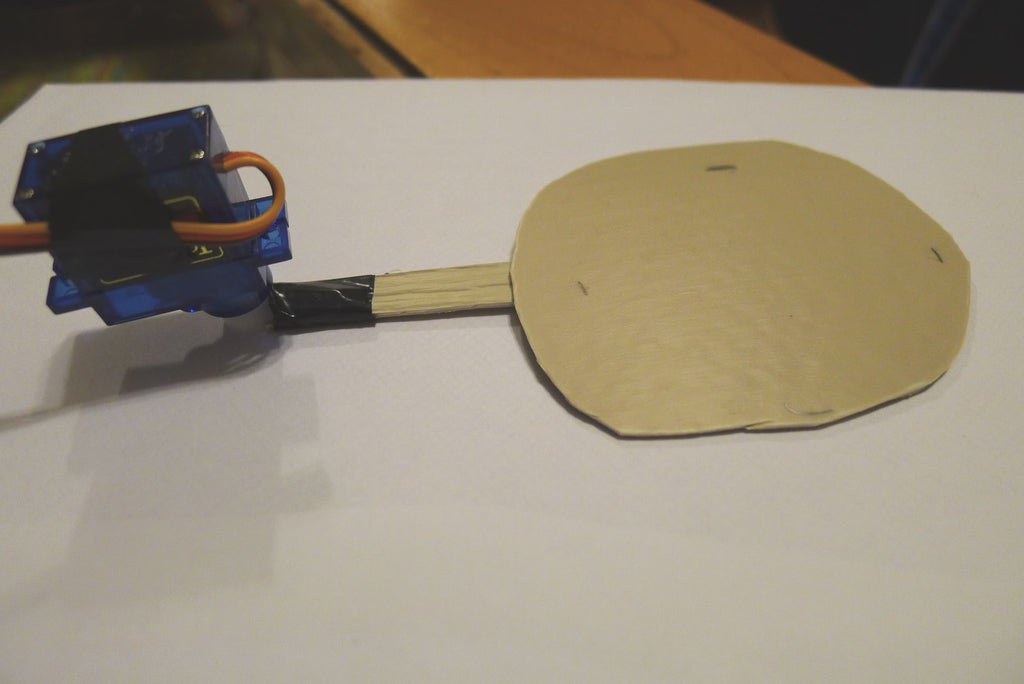 Cut a hole roughly the shape of the servo motor. Poke the servo through the card board. The servo should rest on the extra plastic protrusions and not fall through.