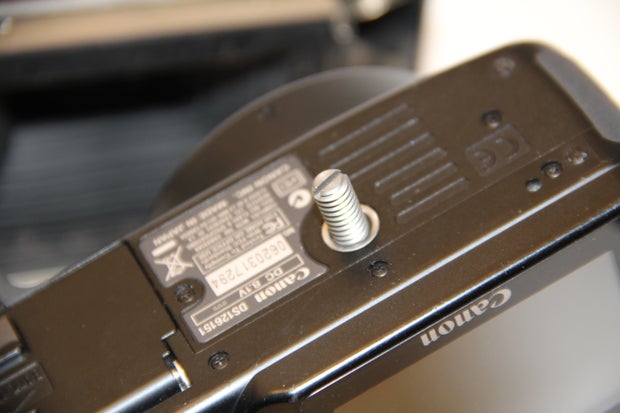 Begin by taking the lens off your Canon Rebel and the rear cover off the KVP (make sure there isn't any film in there!). Next, screw in the headless screws into the tripod holes on the bottom of the cameras. They have been using the same size tripod holes since tripods were invented!
