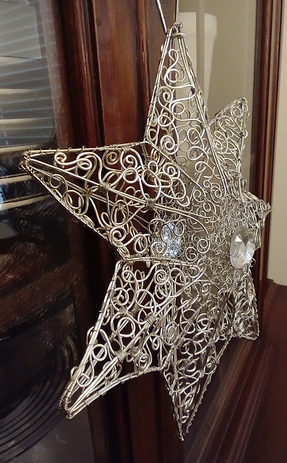 This 3-D Filigree Christmas Star is 7" across & is made using 20 & 26 ga wire w/ an acrylic gem wired to the center of it. There's a front & a back to make it 3-D....so a bit labor intensive to make.