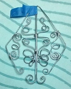 I used graph paper for measuring the frame. The longest side of the frame is 85 mm to give you enough wire to make a curl. The shortest side is 40 mm to give you enough wire to make a curl. The remaining side of the frame is 45 mm. I worked off the spool of 20 ga wire & cut the wire per the template. If you'd like smaller curls, cut 7" of wire & 7.5" of wire for larger curls. *It's very important that you keep the same shape as the template b/c the star is 3-D. You will need to make 28 of these components. The star has a front & back & there will be a total of 14 rays to make it 3-D.