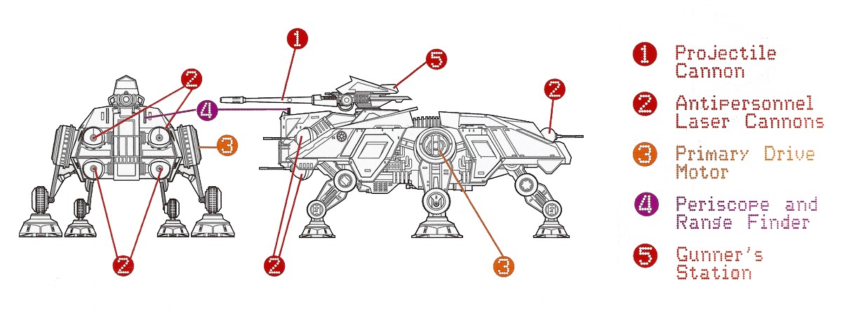 An acronym for All-Terrain, Tactical Enforcer, the AT-TE was the main battle tank used by the Galactic Republic during the Clone Wars. Propelled by six (6) articulated 'legs', the AT-TEs proved highly effective in rugged terrain and was capable of climbing steep walls. The 'tank's main armament consisted of six (6) laser cannon turrets mounted on the front and rear of the vehicle and a gigantic projectile cannon mounted on top of the driver compartment. The gunner of the projectile cannon sits exposed at the rear end of the weapon.