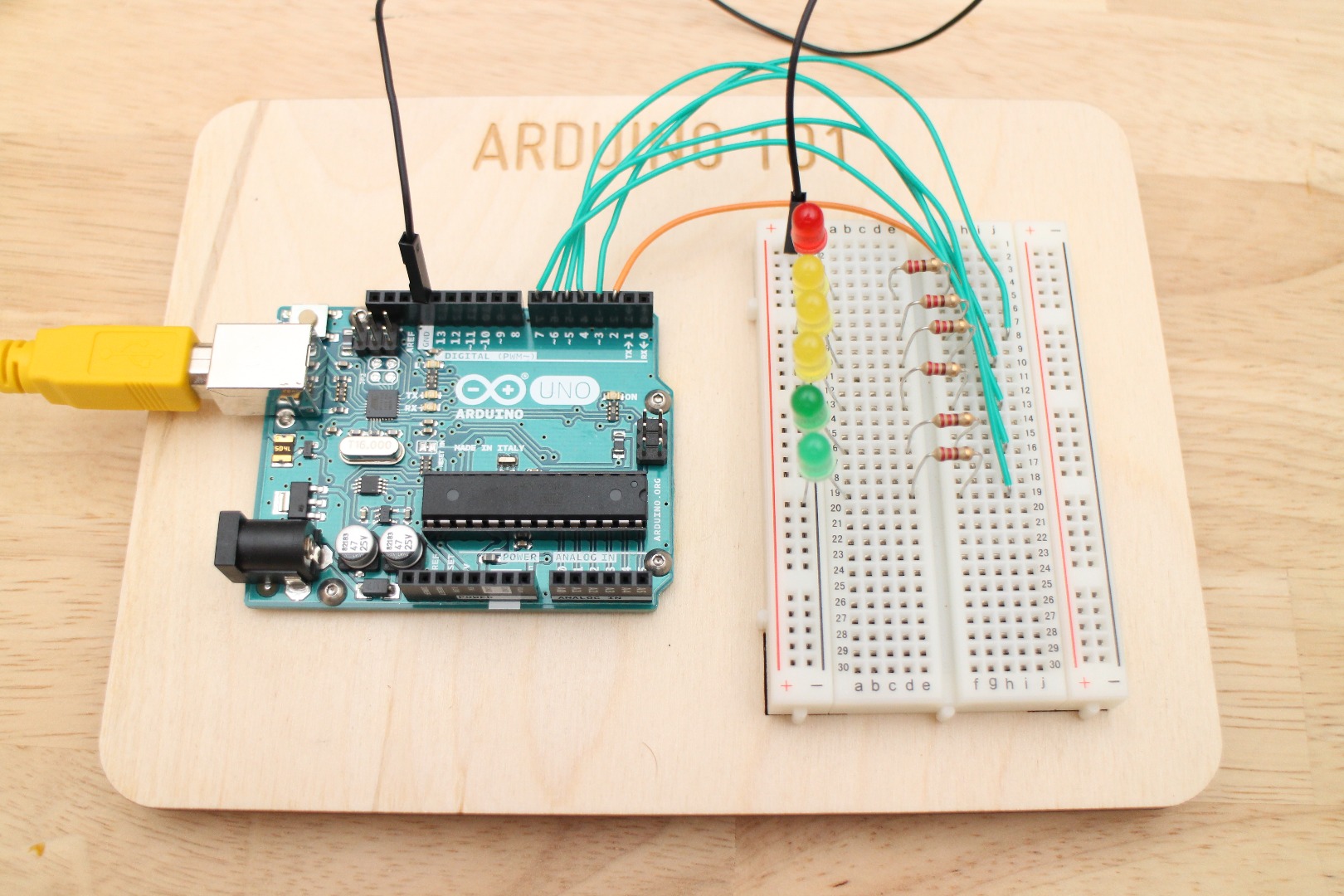 Lets begin by grabbing 6 LED's out of our kit. I chose 2 green, 3 yellow and 1 red. You can add more if you'd like, just make sure you add an extra resistor and wire to an open Arduino pin. Keep in mind that the Arduino can not supply a lot of power, so at a certain point adding more LED's just makes them all dimmer.