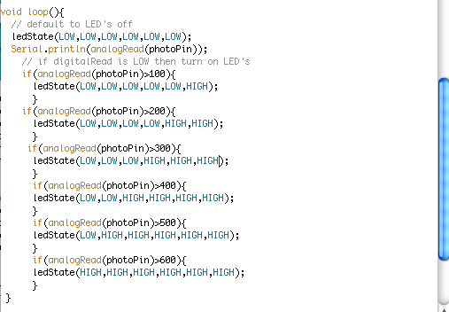 Lets get to the real meat of this code and dive into the main loop. We know we want different LED's to light up in accordance with the distance away your hand is from the sensor. This means that more LEDs should light up when less light is hitting the sensor (as your hand covers it up). As we saw in previous lessons the ADC value of the photoresistor circuit increases with a decrease in light, so we want to structure our code in a way light lights up more LED's as the ADC value increases.