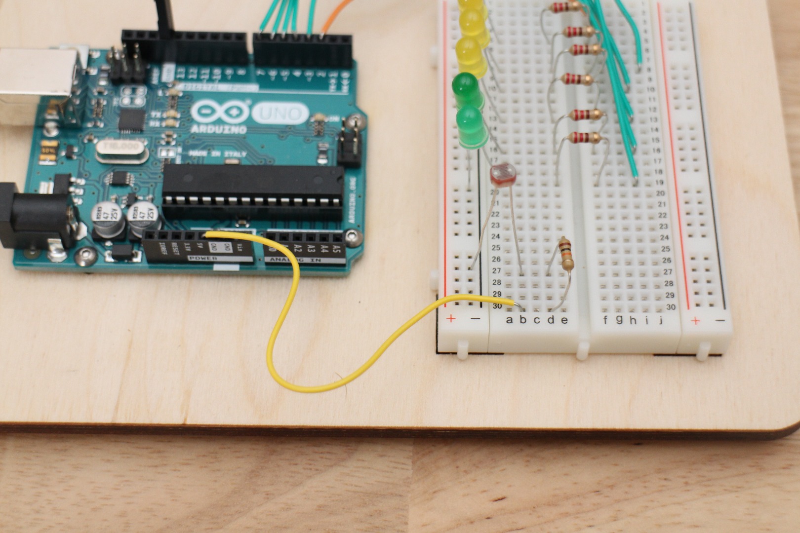 Next add a wire from the 5V output on the Arudino to a different row on your bread board and have the 10K Ohm resistor bridge the 5V power row and photoresistor row.
