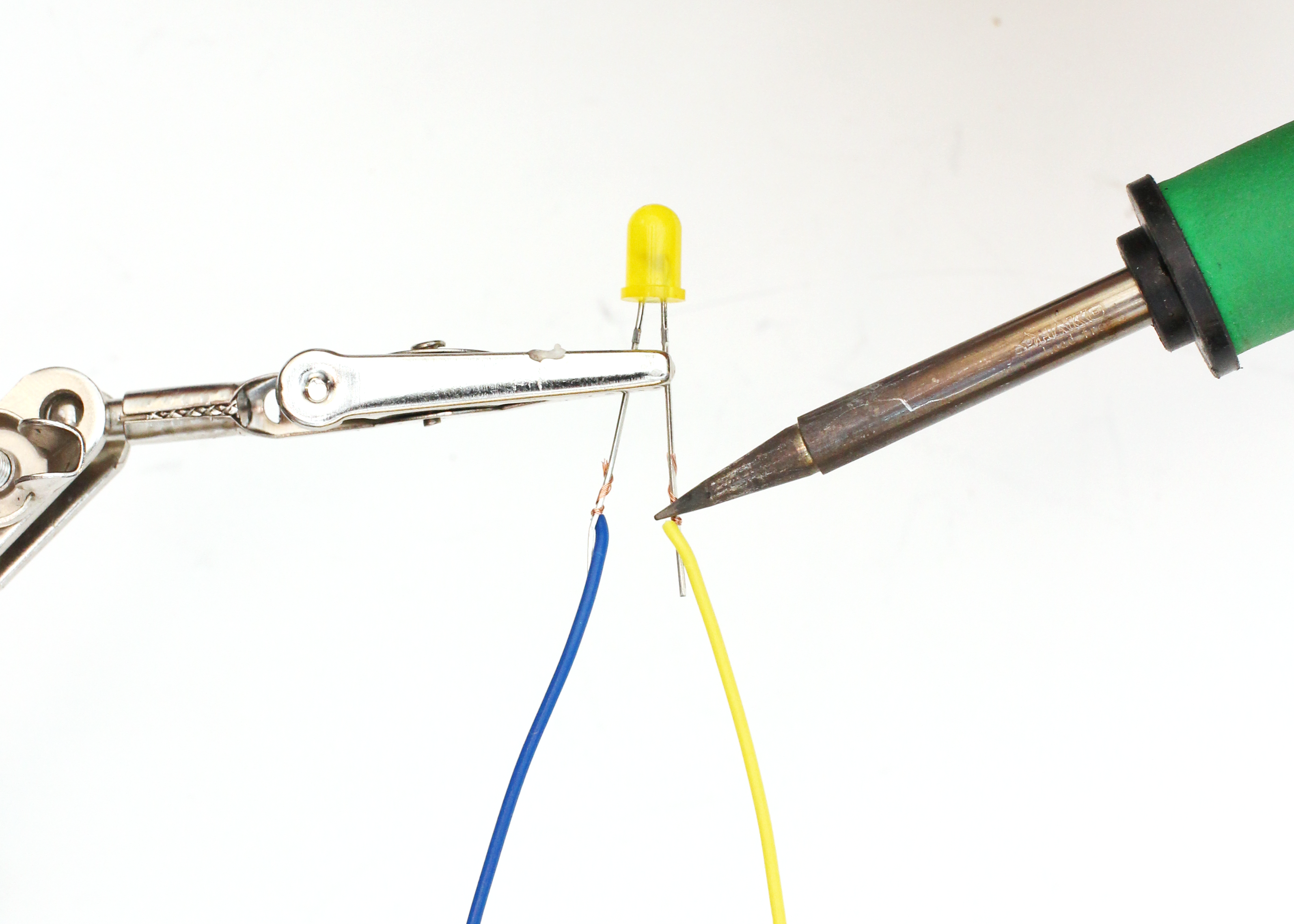Begin by cutting enough wire to cover the positive and negative leads of all 6 LED's and the photoresistor. I used yellow and blue for the negative and positive leads of the LED's. Next, solder these on to the LED's and if you want extra style points you could add come some heat shrink tubing.