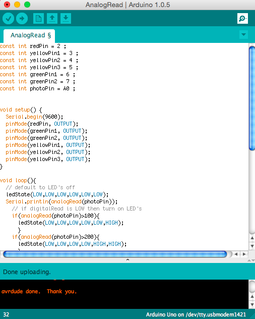 const int redPin = 2 ; const int yellowPin1 = 3 ; const int yellowPin2 = 4 ; const int yellowPin3 = 5 ; const int greenPin1 = 6 ; const int greenPin2 = 7 ; const int photoPin = A0 ;
