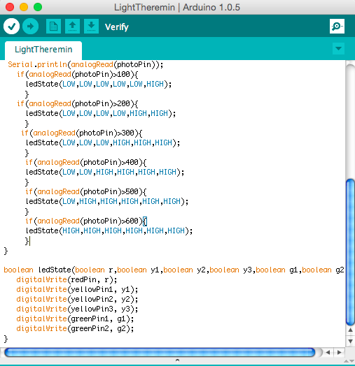 To code the light theremin we are going to expand on the previous analog sensor lesson, and take it a step further by having one sensor trigger multiple LED actions. First, download the attached LightTheremin.ino and open it up in the Arduino IDE. To begin we need to initialize all 6 LED's. I kept the naming conventions fairly standard here, but you can label the LED's according to any convention you prefer.