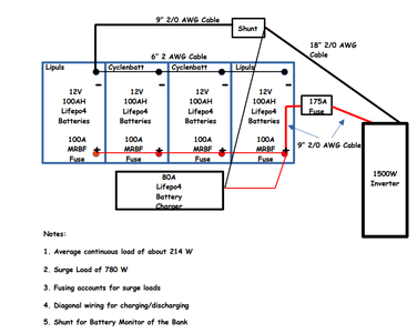 The bank uses five LiFePO4 cells (LiPULS and Cyclenbatt brands, 100Ah each) wired in parallel, each with its own BMS and fuse for safety. All batteries connect to a copper bus bar with M8 bolts, feeding a 1500W pure sine inverter. System protected by both individual 100A MRBF fuses and a main 300A ANL fuse.