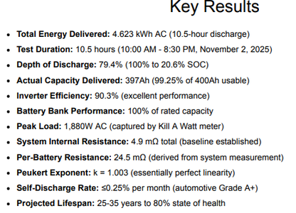 - Capacity delivered: 397Ah (99.25% of rated capacity) over 10.5 hours, 4.62 kWh AC output.