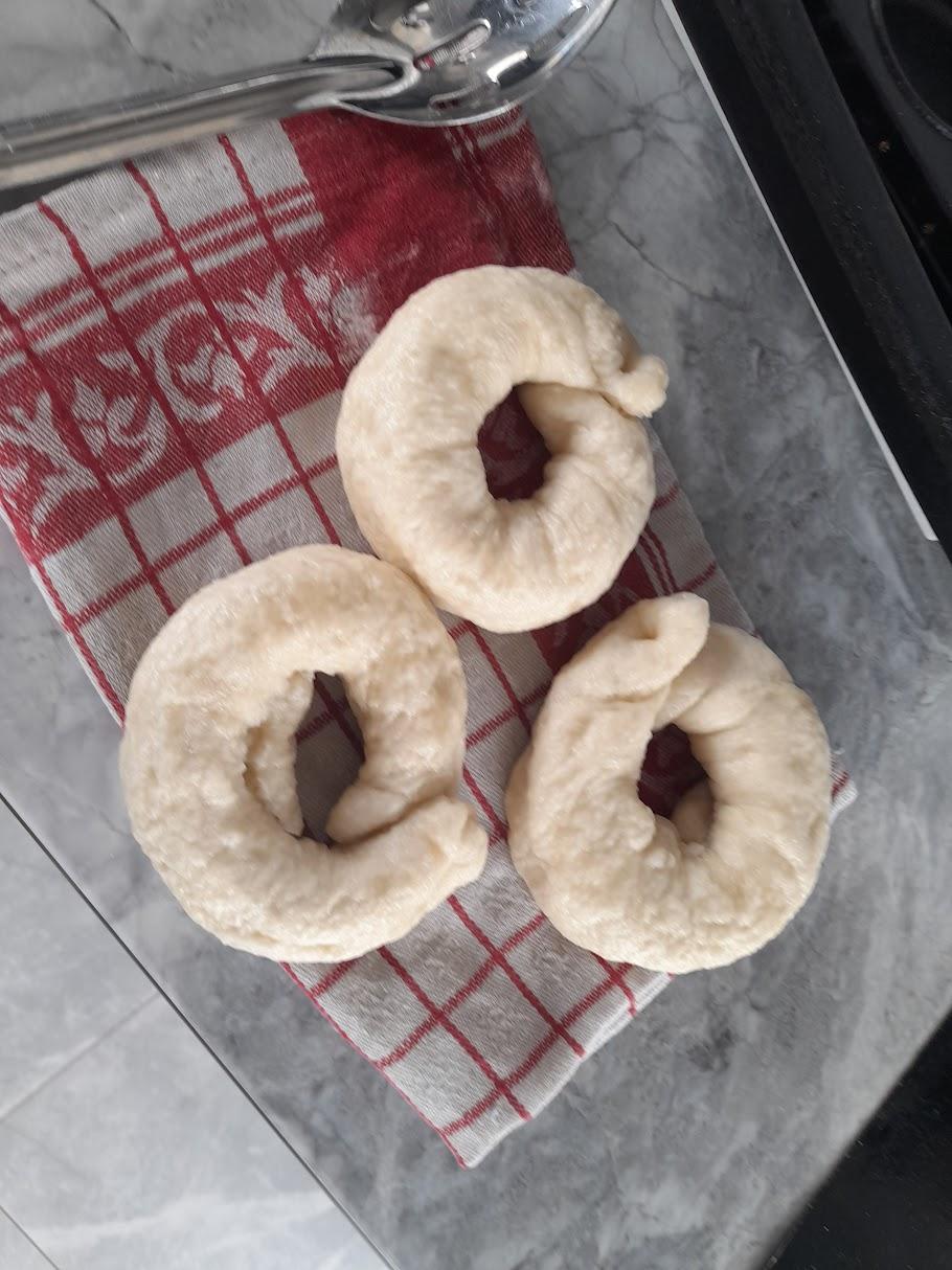 Now you can preheat the oven to 200°C Once the portions have proven, use your fingertips to gently squash the ball into a flat circle (see picture). Next roll the circles in to a cylinder by tightly tucking the edge of the circle into itself. Lastly connect the two ends to form the bagel shape.