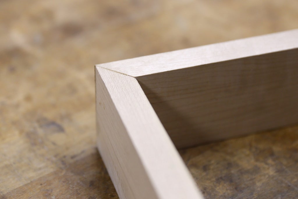 From the Sanding Lesson we know to start with a coarse sandpaper of about 100 grit, paying special attention to the transition between joined pieces and the corners, and working our way up to higher grits. If sanding reveals any more voids at the mitres then reapply the glue and sawdust trick again, wait until dry and then continue sanding.
