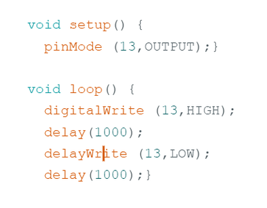 Use the code in the picture to have a blinking LED. The Code was given in class by the instructor from the SPARKFUN Development/Book. The number 13 can be changed depending on what number the Arduino is connected to.