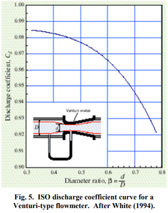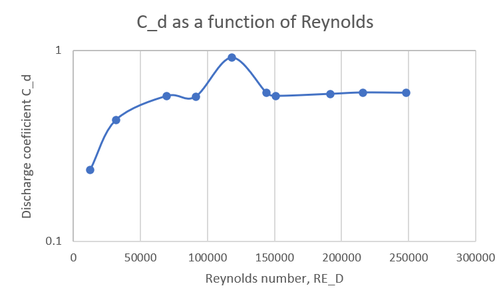 This graph shows the discharge coefficient Cd plotted with respect to the Reynolds number. It is also plotted using a linear-log scale.