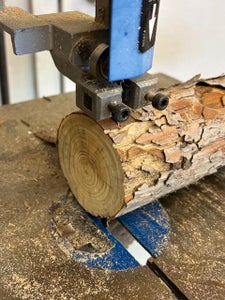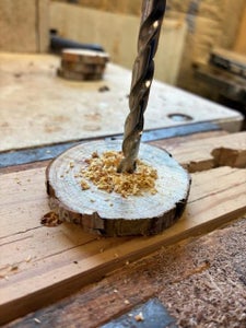 On a band saw or using a hand saw, cut 12-14 slices of the branch 1/4" thick. Smooth any rough surfaces. One by one, set the discs on a backing piece of scrap wood and drill 5/16" or 3/8" holes in the center of the discs.
