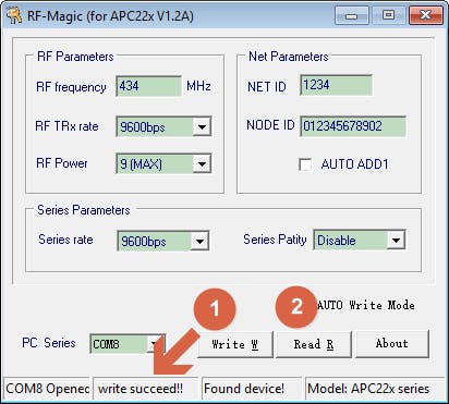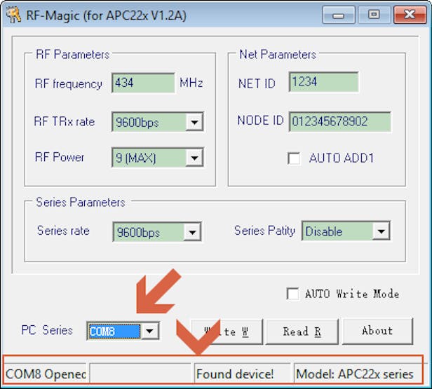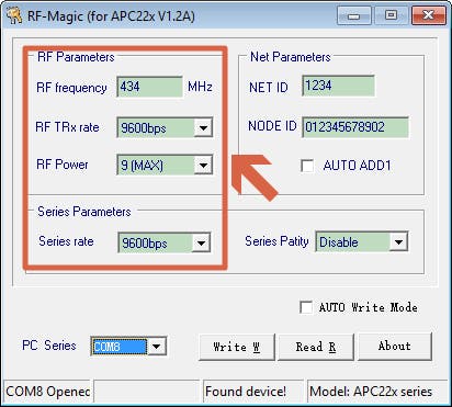 Configure RF-magic as in the red square frame below (default configuration), and click Write W to write your configuration, then click Read R to read the parameters you have set.