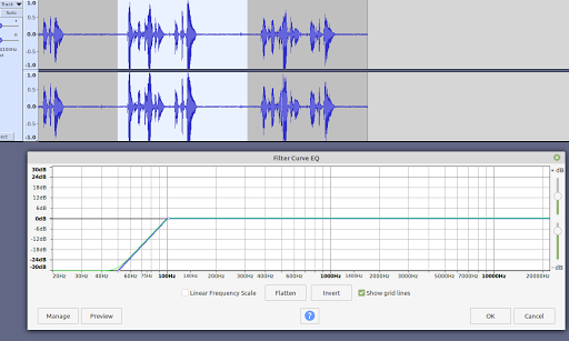 Next, try recording "Peter Piper picked a pickled pepper" and see how many times your mic makes a popping noise. Click effects, filter curve, we can roll off frequencies under 100 or 250Hz as they play no part in speech other than to be annoying. Test a few settings until you get the result that you want. Highlight a short sample to test then try with the full recording before committing to save.