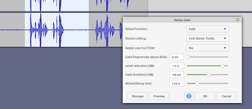 Adjust the gate threshold and click preview until you only hear silence when not talking, set gate frequencies above 250hz to eliminate other noise. Takes some experimenting but well worth it.