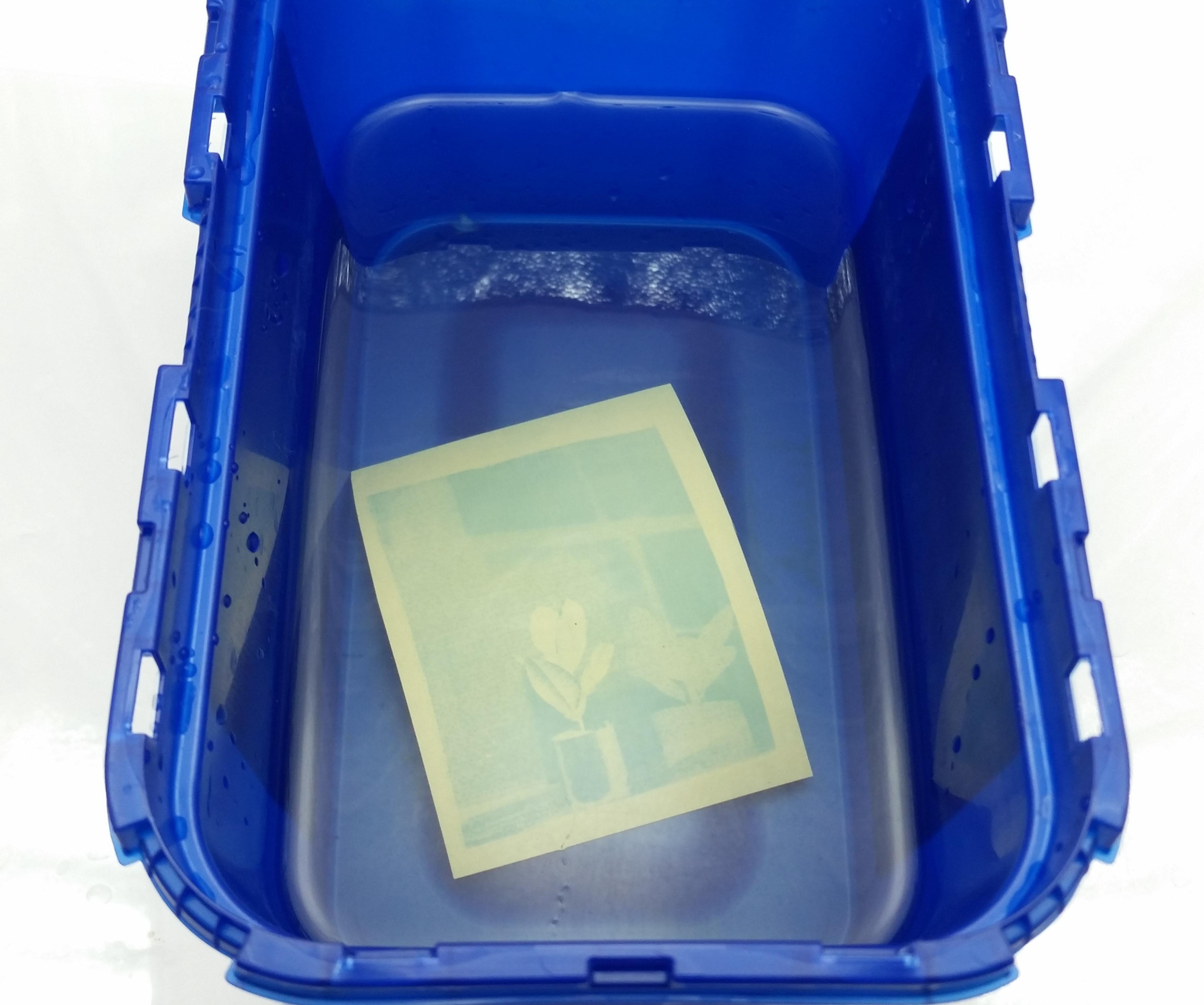 (In this picture you can already see the Prussian blue forming on the paper from the photo box LED's, which is why it is important to work in a dimly lit room)