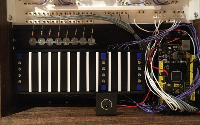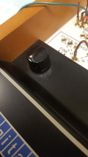 This piece separates the Switch Panel from the Patch Panel, holds the eight output lamps and the fine tuning knob for the clock speed, and also transitions from the higher Switch level to the lower Patch level within the wooden frame.