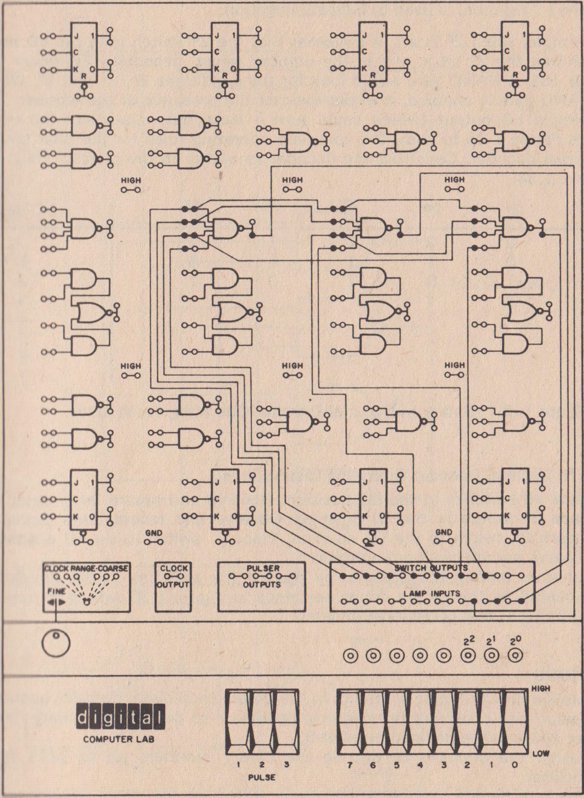 The machine itself shipped with a wonderful Computer Lab Workbook, written by the designer, that contained a complete course in digital electronics. Together the COMPUTER LAB package was intended to accompany courses in binary arithmetic, Boolean algebra, digital logic or computer technology. While not a true computer, the H-500 could be "wired" to perform many of the underlying operations of a true computer using a point-to-point patch cord mechanism.