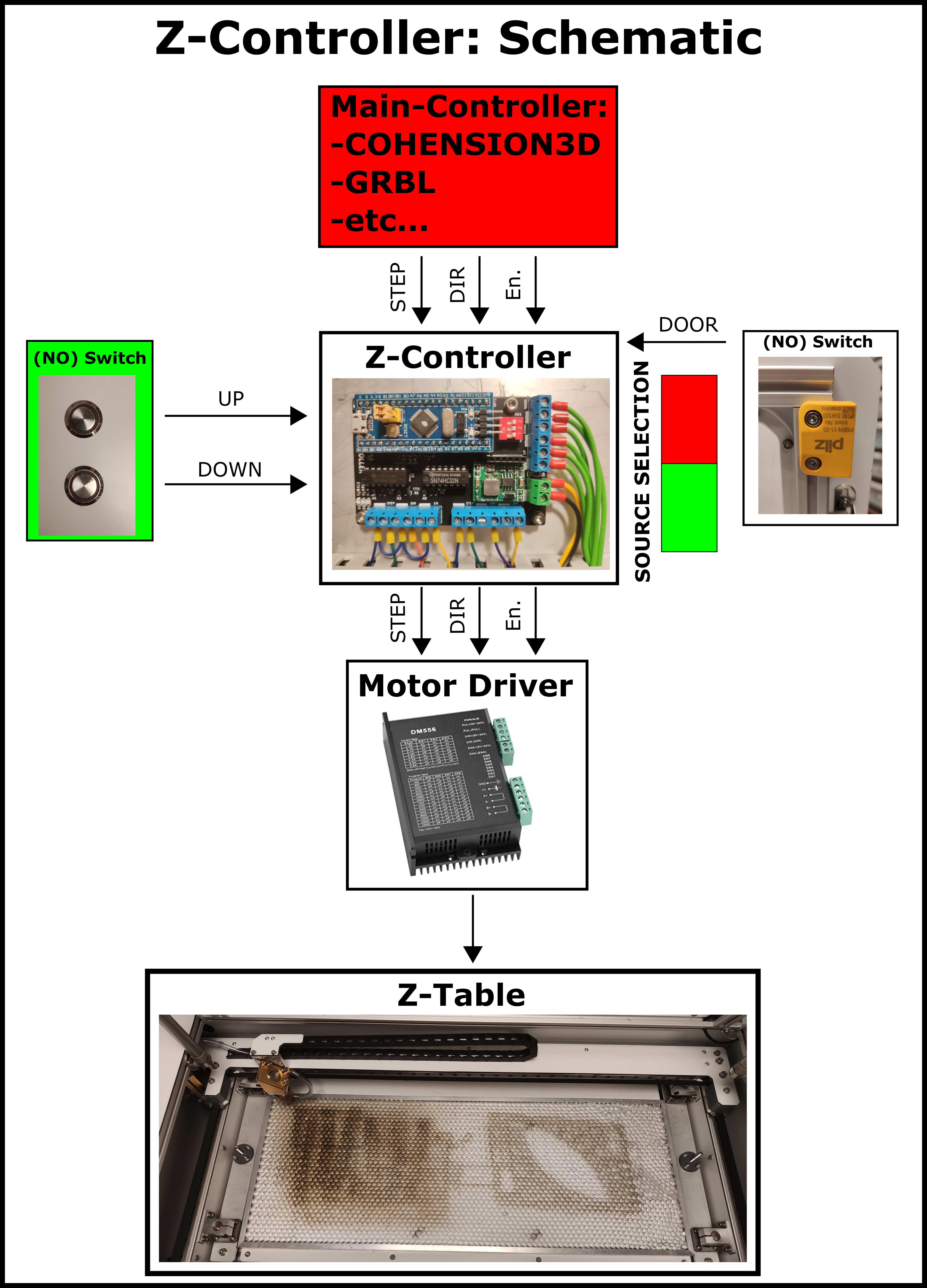 As the Main Controller I have used a Cohension3D Mini Board from my old K40 Laser. This Board supports Smoothieware as Firmware and all the features which come from Lightburn. In addition to the Main Controller I have also created a dedicated Controller for the Z-Axis.