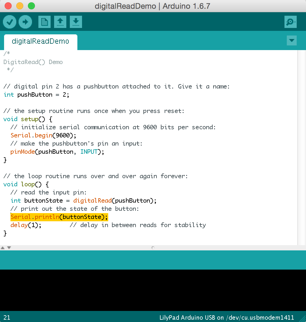 To read a switch you must always either enable the pull-up resistors or add a pull-down resistor to the circuit yourself. This is the final digitalReadDemo sketch! Let's take a look at what this code is doing.