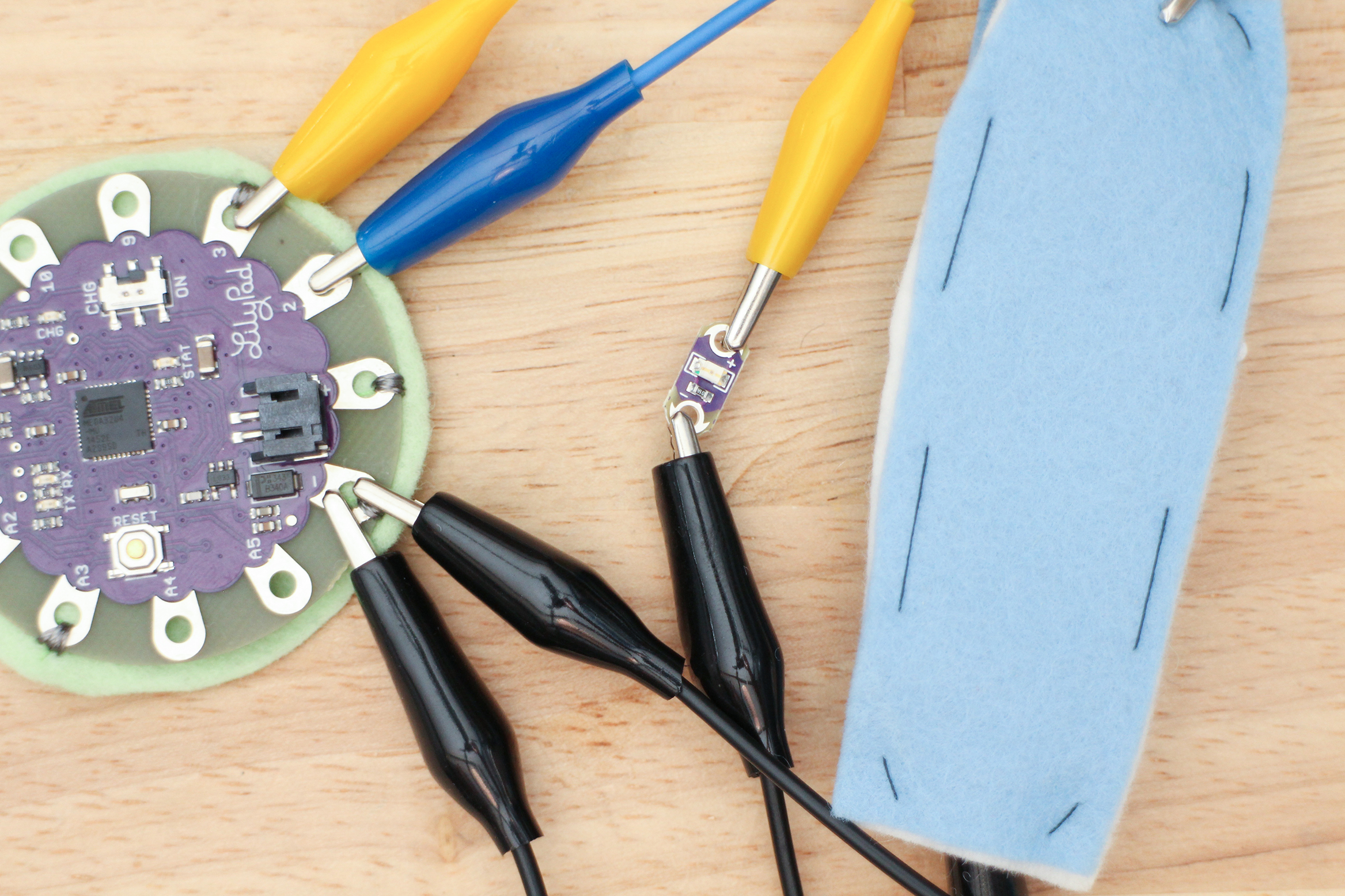 So far, you have learned how to blink an LED output and read a switch input. Now, let's get one affecting the other. Keep the switch on pin 2 and make these new connections using a sewable LED: