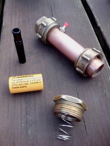 Simple construction from 22mm copper pipe, two stop ends, a couple of springs, simple push switch, standard battery and a replacement e-cig connector.