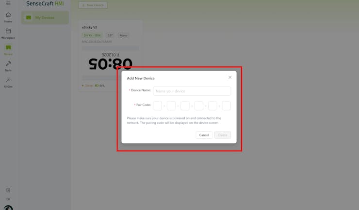 To add a new device to the SenseCraft HMI, go to "My Devices" and click on "+ New Device." You can now name your device and enter the pairing code. After that, the device will be successfully added.