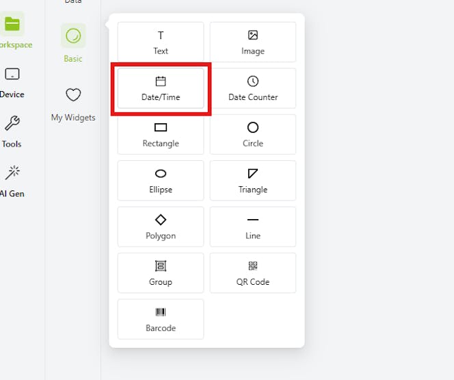 To add the date and time, click on the "Date/Time" option in the basic menu.