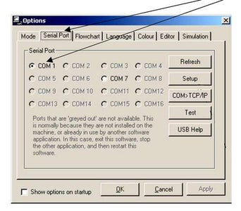 Click on the Serial Port tab and select the COM port where your USB Programming Cable is connected. Click the Ok button to go to the programming editor. In the Programming editor click File and then click New Flowchart to start entering your flowchart.