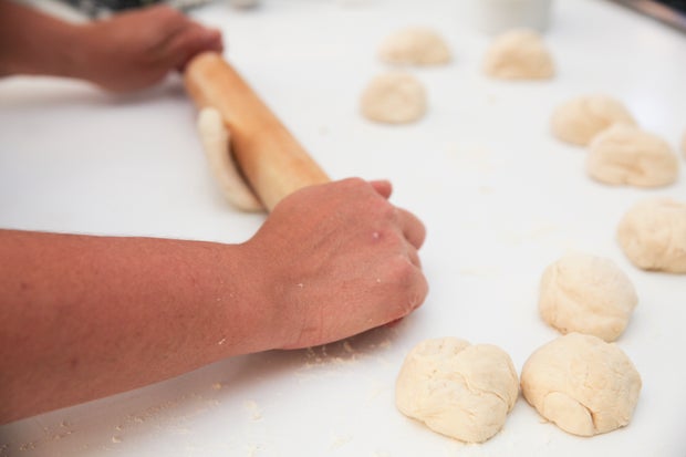 One by one, flatten the rounds into discs with your hands, then roll with a rolling pin until they are between 1/16th and 1/8th inch thick. If you like them a little doughier leave them a little thicker, but you get better air pockets when they are thinner.