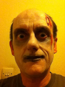 Finally, the bloody head wound - we also found a tube of fake blood. After applying a smudge of red face-paint, my colleague simply drew on trails of gore. She reasoned that a true Evil Mad Scientist would not care about Health & Safety...