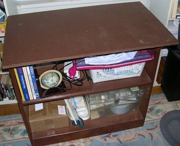 I had a little two-shelf bookcase that my late father-in-law had modified to my specs - I wanted the top to be bigger so I could put my sewing machine on it. The second picture shows the particle board extension from below. It worked for awhile, then life got busy and I didn't sew for like, 15 years. When I decided I wanted to start up again, we had moved to a place where the only room available was a teeny bedroom with very limited space. I thought I could convert the thing to a foldable work table, to get it out of the way when I'm not sewing. My late husband left me a garage full of a lot of tools (most of which I don't know how to use) and some wood - 2x2s, 2x4s, sheets of plywood, some particle board, etc. and lots of things like screws, nails, and hinges etc. I figured I could put this thing together without spending any money except for paint. Funny how these things always only take an afternoon in my mind...