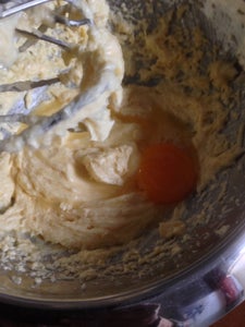 Add one egg at a time whisking each one for about 1/2 minute at the highest setting.Add the sifted flour to the egg mixture in two stages,briefly stirring with a mixer at the medium setting.
