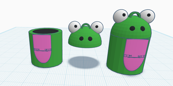 For the fifth step, we used a website called OnShape to create a design for the lid. We designed a frog head with two big eyes on top and a handle in the middle between them, ensuring it fit the measurements of the top of the trash bin!