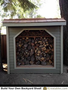 Firewood shed wood shelf used to store smaller kindling above the firewood wood stack
