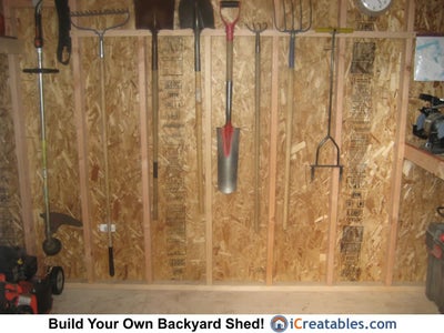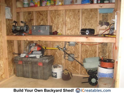 Storage shelves built using 2x4 boards and scrap O.S.B. sheeting used to build the shed