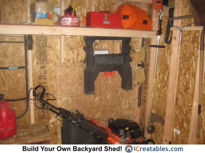 Shelves up high allow storage of large tools on the shed floor below.