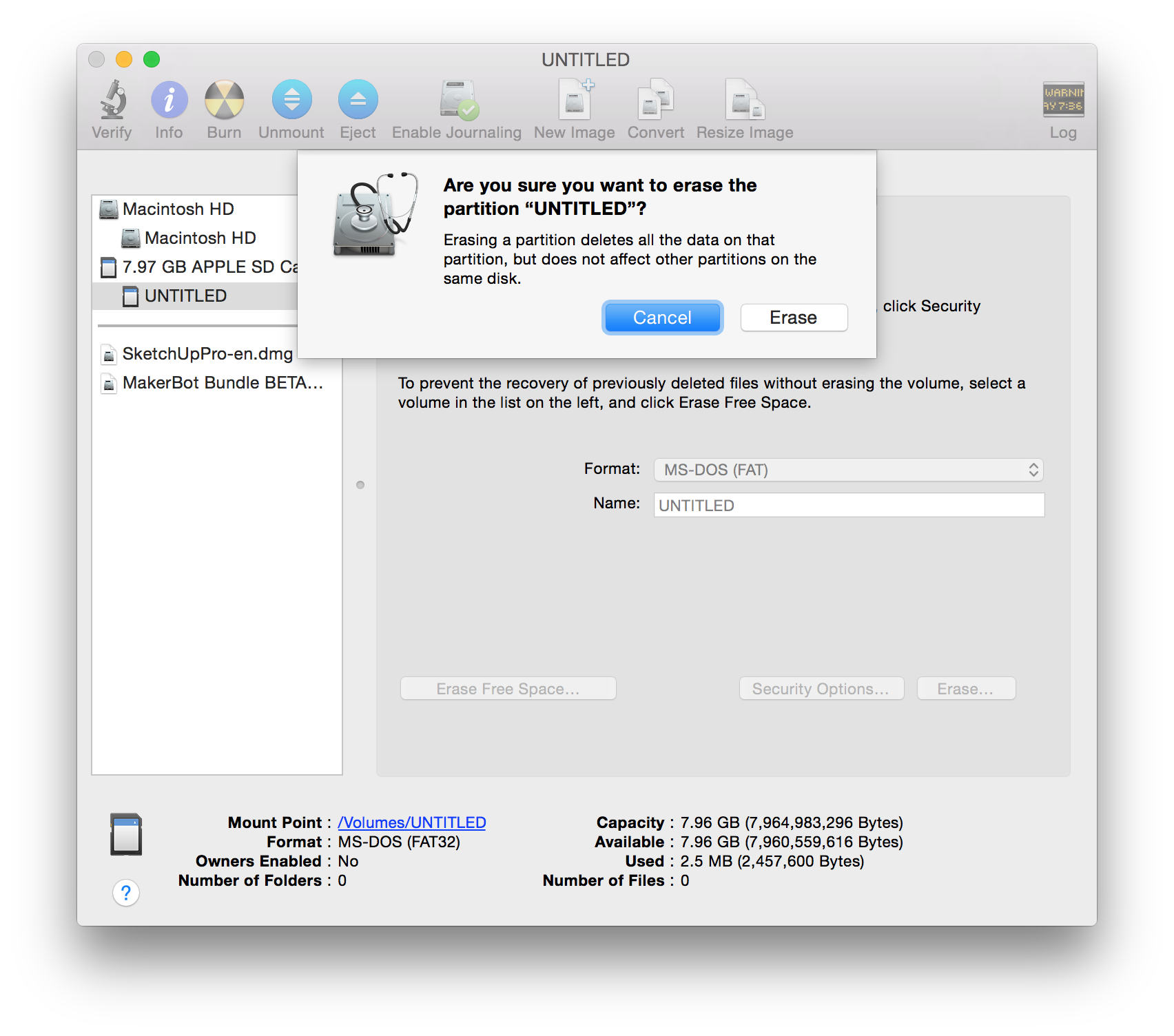 Choose the card from the left side menu. Mine is called "UNTITLED". It is critical to choose the correct disk, or you risk deleting your primary hard drive with all your data! If you're not sure, do not proceed, instead post a screenshot in the questions section below and we'll help you figure it out.