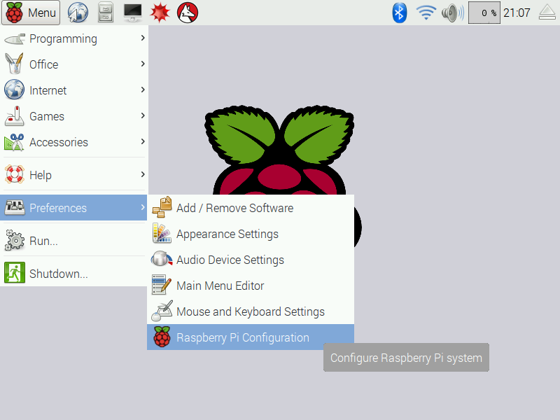 Configuring the Raspberry Pi is one of the first things you want to do to a newly installed OS. There are two ways to do this: through the desktop and through the command-line. To change configurations through the desktop, click the Menu and navigate to Preferences > Raspberry Pi Configuration.