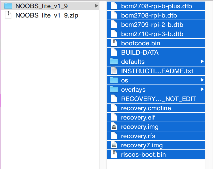 Download the latest version of NOOBS from Raspberry Pi's Download page and extract the files from the .zip file. Download the full version, not the Lite version, since that relies on a net connection we have not yet established.