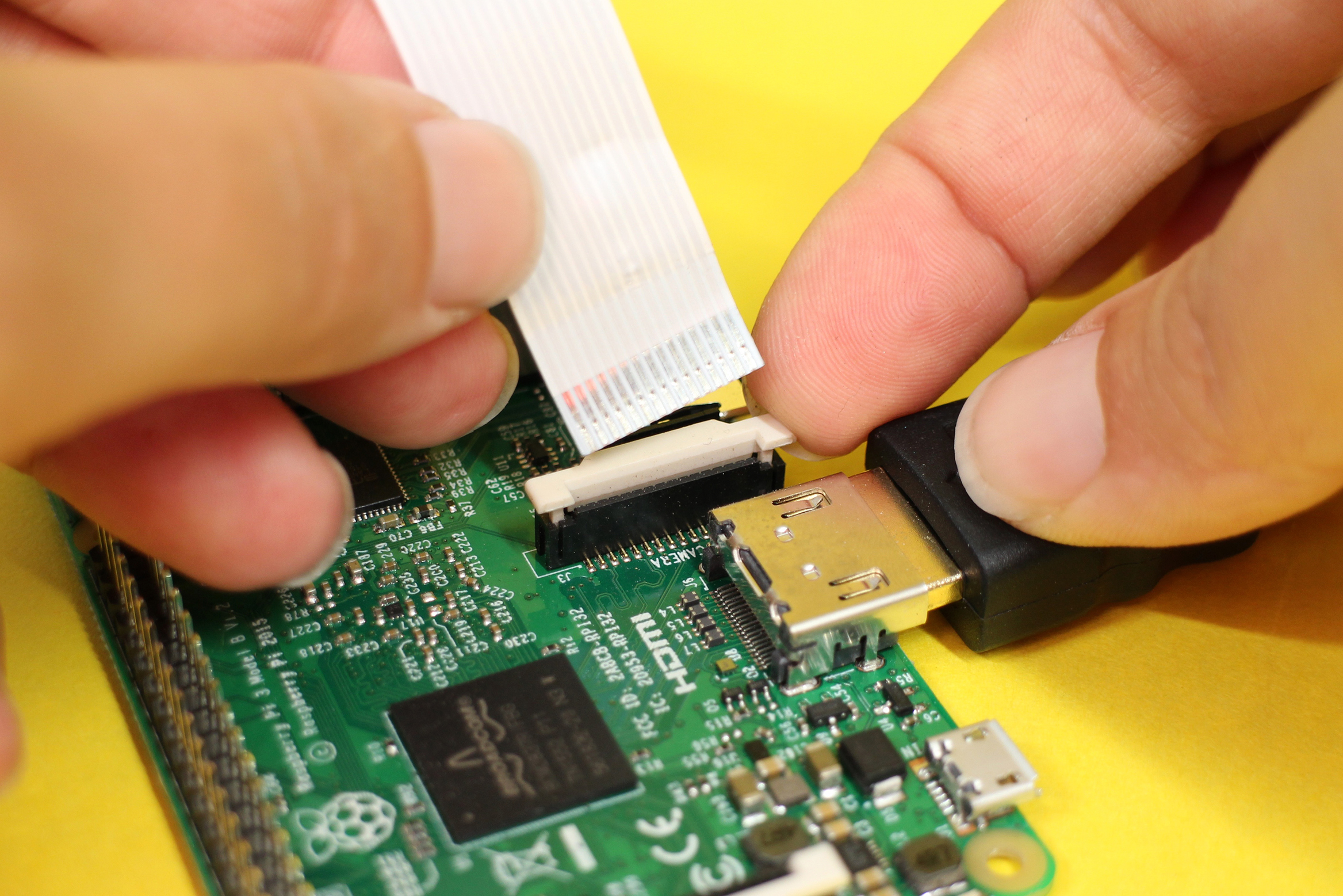 Out of the myriad ways the Raspberry Pi can send images to a display, you will use the HDMI port. If your display has a base, connect it to the screen so it can stand on its own and grab your HDMI cable. Locate the HDMI port on the back of the screen and plug it in. Plug the other end into the Raspberry Pi's port and you have a screen!