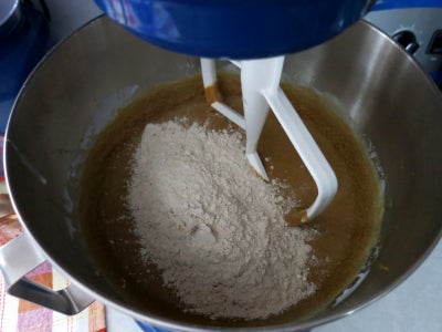 Beat in the flour mixture on medium-low speed until the batter is smooth and thick, about 1 minute, scraping down sides of bowl with