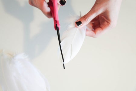 OPTIONAL: Cut the tip of the feather in an arrow shape, rounding the sides a bit with your scissors. I find that cutting the feather at the tip makes for a cleaner look in the end product. If you are pre-cutting, I recommend doing them all at the same time because your hands might get messy later.