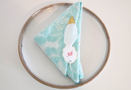 Slide your feather through the top hole and out the bottom. Use the tags as holiday table settings or on gifts.