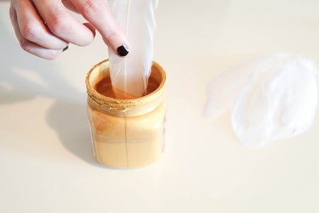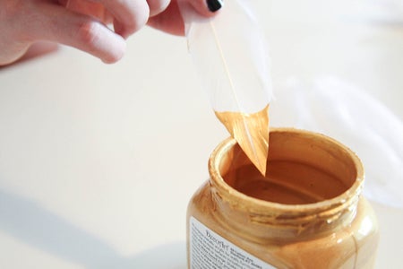 Dip feather into paint, making sure the front and back are as evenly coated as possible. Carefully wipe excess paint off the feather on the side of your jar.
