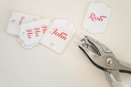 Using a standard hole punch (we used a heart-shaped one), make a hole in the center at the top and bottom of the tags.