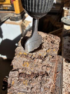 Secure the piece and drill a 1-1/2" hole in the top. Make sure the bit is vertical as you drill. Brush away any sawdust and debris. Insert the test tube to make sure it fits properly. You might want to glue a piece of felt to the bottom of the log to protect furniture. Add decorative grasses or whatever you want to the tube.